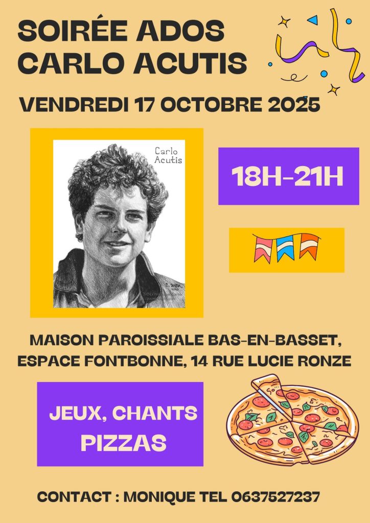 Soirée ados Carlo AcutisPar Monique / 17 octobre 2025 Vendredi 17 octobre 2025 18h-21h Bienvenue à tous les jeunes à partir du CM2 !